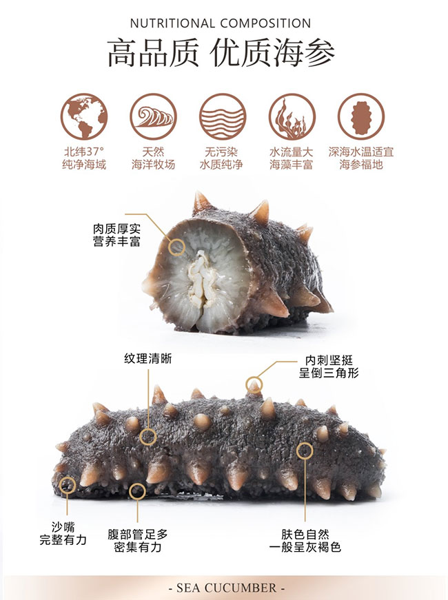 海參屬于無脊椎動物、棘皮動物門、海參綱。我國海參分布在溫帶區(qū)和熱帶區(qū),溫帶區(qū)主要在黃渤海域,主要經濟品種是刺參,也是我國最為知名的海參種類,熱帶區(qū)主要在兩廣和海南沿海,主要經濟品種有梅花參等。其中西沙群島、南沙群島和海南島是我國熱帶海參的主要產地。海參在各類山珍海味中位尊“八珍”,還具多種中醫(yī)特指的補益養(yǎng)生功能。近半個世紀以來,國內外學者對40多種海參化學成分的研究表明海參體內不但富含氨基酸、維生素和化學元素等人體所需的50多種營養(yǎng)成分,還含有多種生物活性物質如酸性粘多糖、皂苷和膠原蛋白等,而且海參活性物質的藥理活性十分廣泛。